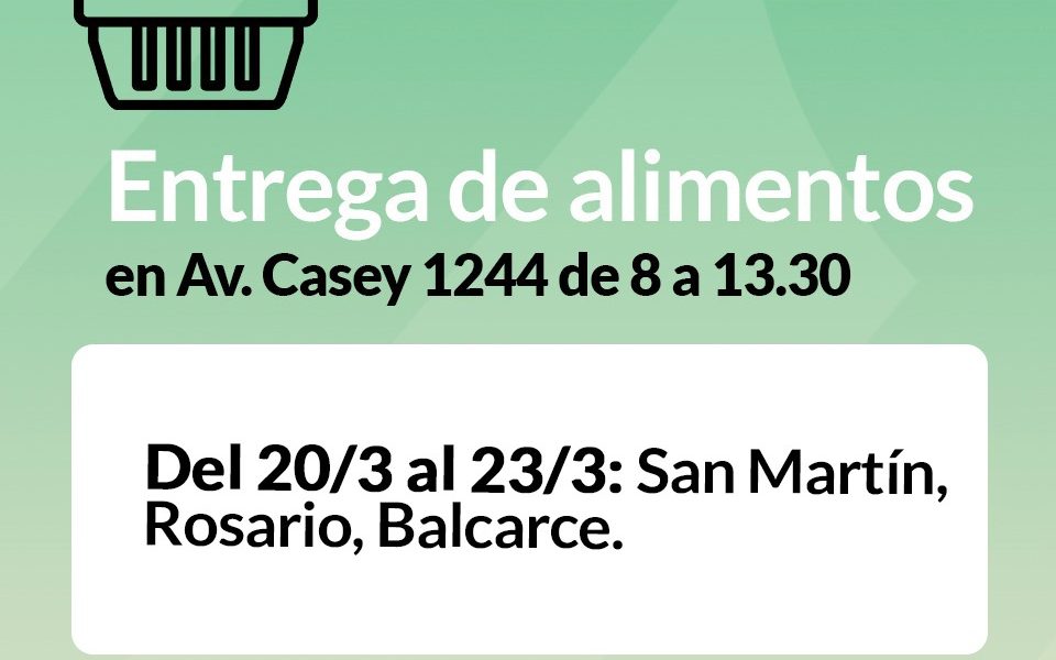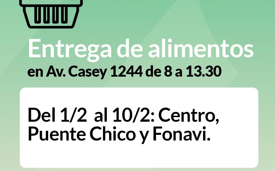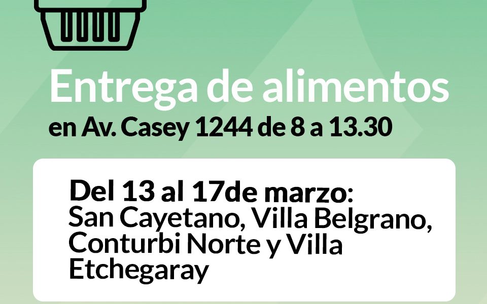 La subsecretaría de Desarrollo Social informa a las familias asistidas que continúa la entrega de alimentos secos correspondiente al mes de MARZO, en Avenida Casey 1244, de 8 a 13:30. Las familias beneficiarias deberán respetar el cronograma de entrega SIN EXCEPCIONES. Del 13/3 al 17/3: San Cayetano, Villa Belgrano, Conturbi Norte y Villa Etchegaray Del 20/3 al 24/3: San Martín,