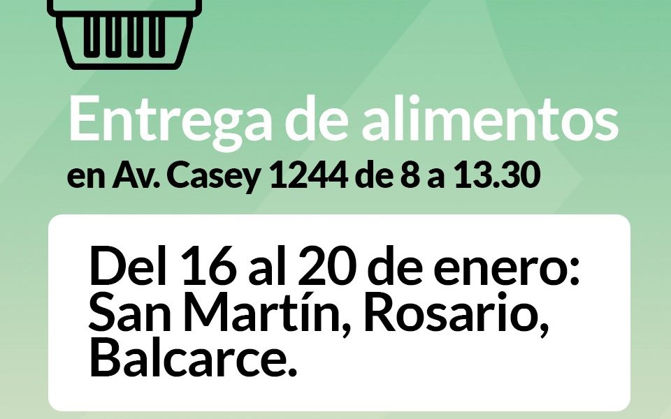 La subsecretaría de Desarrollo Social informa a las familias asistidas que continúa la entrega de alimentos secos correspondiente al mes de ENERO, en Avenida Casey 1244, de 8 a 13:30. Las familias beneficiarias deberán respetar el cronograma de entrega SIN EXCEPCIONES. Del 16/1 al 20/1: San Martín, Rosario, Balcarce.