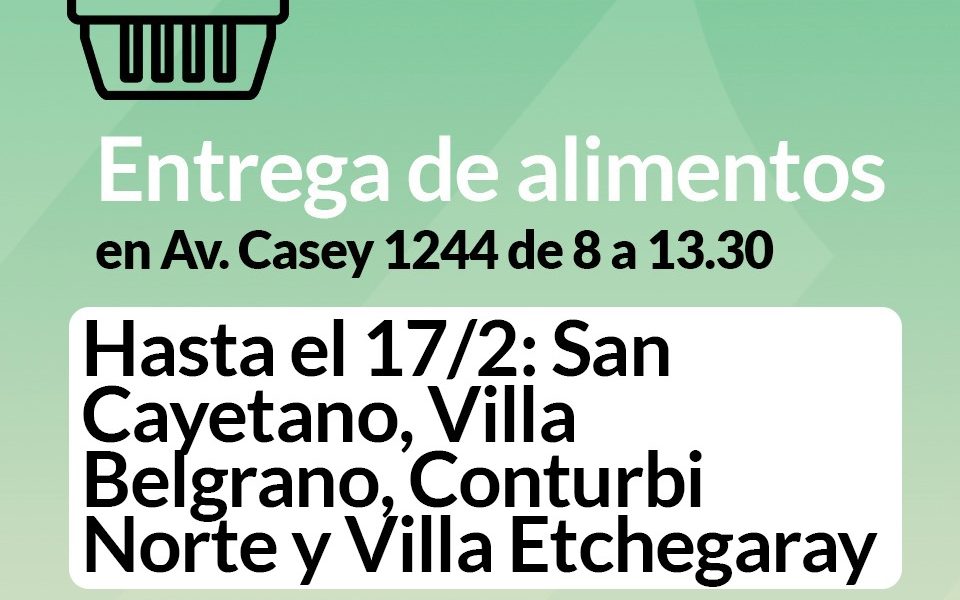 La subsecretaría de Desarrollo Social informa a las familias asistidas que continúa la entrega de alimentos secos correspondiente al mes de FEBRERO, en Avenida Casey 1244, de 8 a 13:30. Las familias beneficiarias deberán respetar el cronograma de entrega SIN EXCEPCIONES. Del 13/2 AL 17/2: San Cayetano, Villa Belgrano, Conturbi Norte y Villa Etchegaray Del 22/2 AL 28/2: San Martín,
