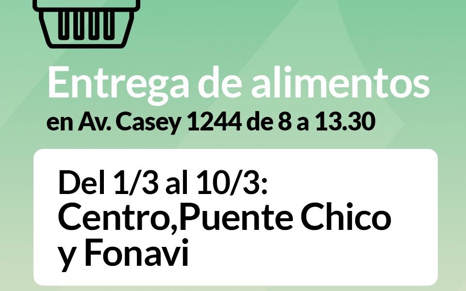 La subsecretaría de Desarrollo Social informa a las familias asistidas que continúa la entrega de alimentos secos correspondiente al mes de MARZO, en Avenida Casey 1244, de 8 a 13:30. Las familias beneficiarias deberán respetar el cronograma de entrega SIN EXCEPCIONES. Del 1/3 al 10/3: Centro, Puente Chico y Fonavi. Del 13/3 al 17/3: San Cayetano, Villa Belgrano, Conturbi Norte