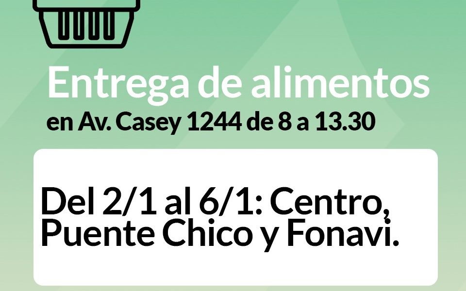 La subsecretaría de Desarrollo Social informa a las familias asistidas que continúa la entrega de alimentos secos correspondiente al mes de ENERO, en Avenida Casey 1244, de 8 a 13:30. Las familias beneficiarias deberán respetar el cronograma de entrega SIN EXCEPCIONES. Del 2/1 al 6/1: Centro, Puente Chico y Fonavi. Del 9/1 al 13/1: San Cayetano, Villa Belgrano, Conturbi Norte