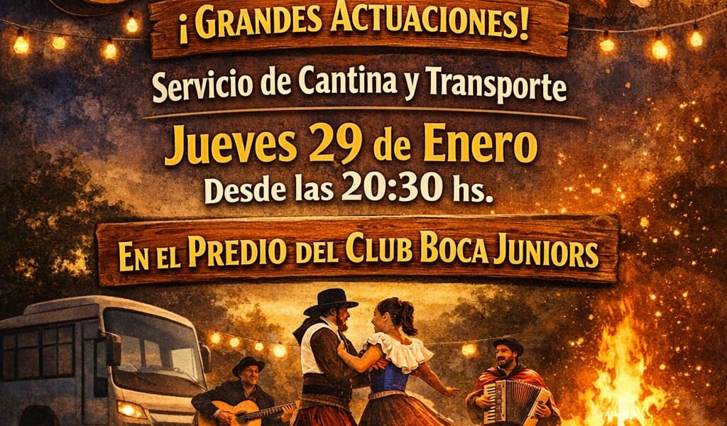 Te esperamos para disfrutar de una noche a puro folclore, música y baile En el predio del Club Boca Juniors Jueves 29 de enero Desde las 20:30 hs Habrá grandes actuaciones, servicio de cantina y transporte. ¡No te olvides de traer tu reposera! Organiza: Consejo de Personas Mayores de Coronel Suárez. ¡Una propuesta para compartir, disfrutar y celebrar nuestras tradiciones!