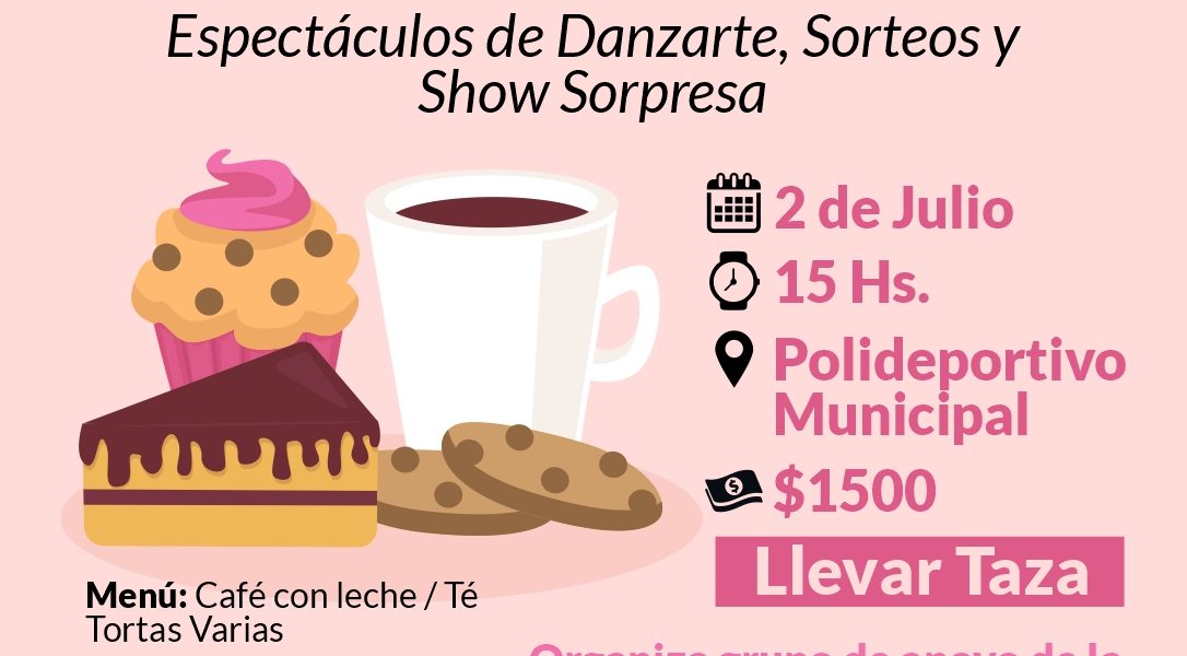 El Grupo de Apoyo de la Comparsa de Personas Mayores invita a la comunidad a la Gran Tarde de Café con Torta que organiza para el próximo domingo 2 de julio, a las 15:00, en el polideportivo municipal. El valor de la entrada es de $1500 y podrán disfrutar de espectáculos de Danzarte, show sorpresa y servicio de cantina. Por