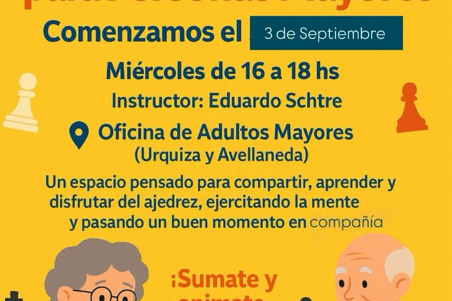 El Consejo de Personas Mayores invita a participar del Taller de Ajedrez para Personas Mayores, un espacio pensado para compartir, aprender y disfrutar de este apasionante juego mientras ejercitamos la mente y pasamos un lindo momento en compañía. Comienza el 3 de septiembre Miércoles de 16 a 18 hs Instructor: Eduardo Schtre Oficina de Adultos Mayores (Urquiza y Avellaneda)