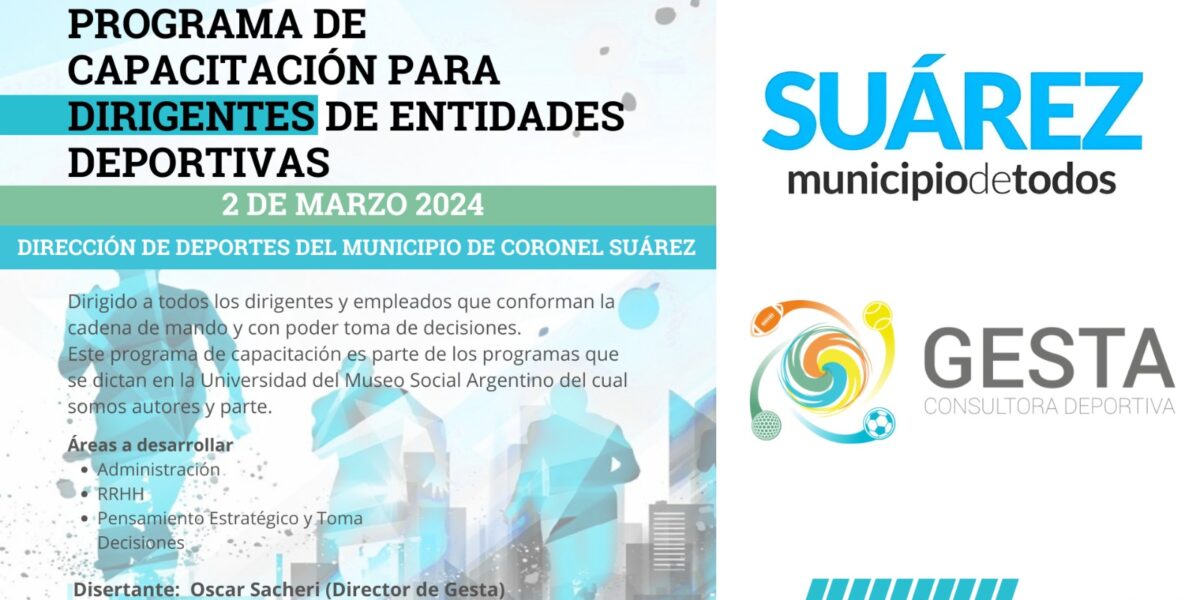Sábado 2 de marzo a las 9:30, en el SUM del Municipio. La propuesta está destinada a dirigentes y empleados que conforman la cadena de mando y con poder de toma de decisiones. Oscar Sacheri, director de la consultora deportiva GESTA, disertará sobre administración, recursos humanos, pensamiento estratégico y toma de decisiones.