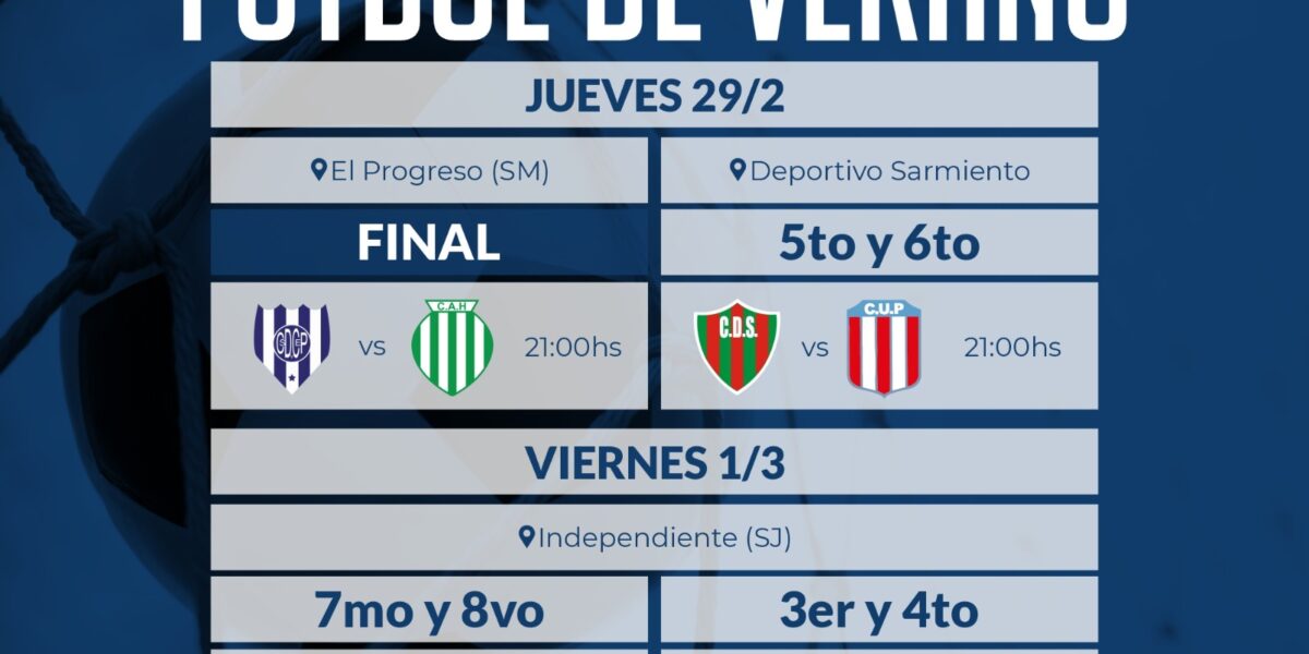 Será este jueves 29 de febrero, a las 21:00, en el Campo de Deporte “21 de Agosto” de Pueblo Santa María. Resultados del fin de semana: ZONA B: -EL PROGRESO 2 (BALVIDARES SEBASTIAN, ORTELLI MATIAS) INDEPENDIENTE 1 (ALIBERTI EMILIANO) -BLANCO Y NEGRO 2 (MARIANO RECOFSKY, MANUEL DI ROCCA) DEPORTIVO SARMIENTO 2 (GONZALO LANG, TOMÀS MONGE) Concluida la fase preliminar, para