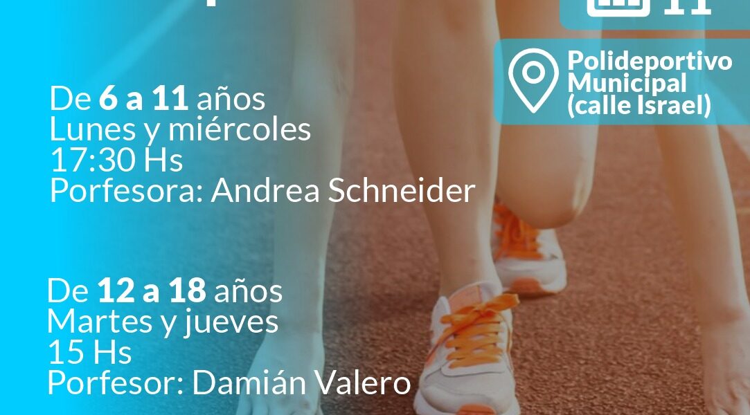 Las clases comienzan el próximo lunes 11 de marzo en el Polideportivo Municipal de calle Israel. Atletismo Juvenil a cargo del profesor Damián Valero De 12 a 18 años Horario 15 hs Días: martes y jueves Escuelita de Atletismo a cargo de Andrea Schneider. De 6 a 11 años Días: Lunes y miércoles de 17.30 hs a 18.30 hs