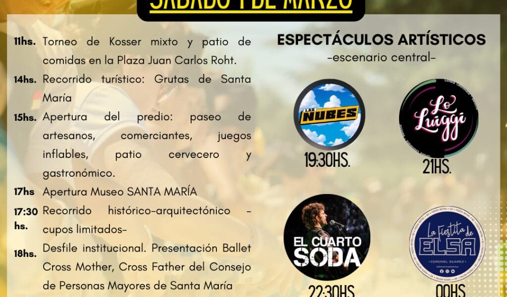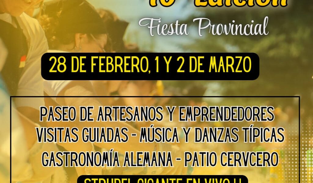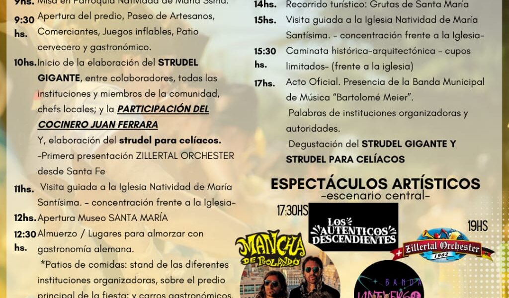 La fiesta que mantiene viva la cultura, las tradiciones de los Alemanes del Volga se llevará a cabo del 28 de febrero al 2 de marzo en Pueblo Santa María. Se presentarán agrupaciones de música, danzas típicas, visitas guiadas y actividades para toda la familia! Es la 10°! Vamos por más! Queremos que todos uds. sean parte de esta FIESTA