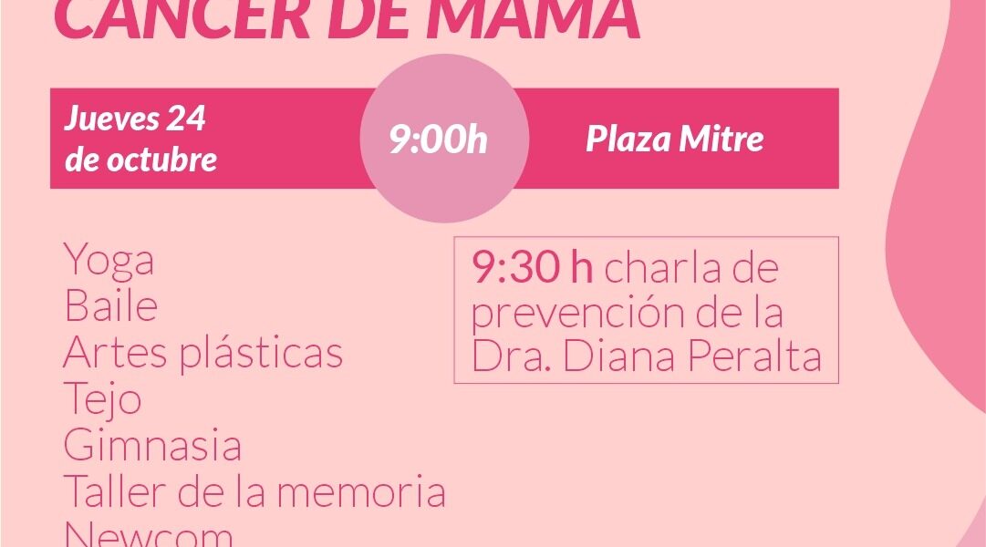 En el marco del Mes de Sensibilización sobre el Cáncer de Mama, el Consejo de Personas Mayores sale a la calle el próximo jueves 24 de octubre, a las 9:00, con una jornada de prevención y concientización en la Plaza Mitre. A las 9:30, la Dra. Diana Peralta, brindará una charla de prevención de la enfermedad, mientras que desde el