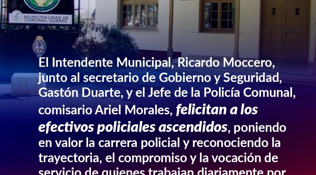El Intendente Municipal, Ricardo Moccero, junto al secretario de Gobierno y Seguridad, Gastón Duarte, felicitan a los efectivos policiales ascendidos, poniendo en valor la carrera policial y reconociendo la trayectoria, el compromiso y la vocación de servicio de quienes trabajan diariamente por el bienestar de nuestra comunidad. Estos ascensos reflejan el esfuerzo, la formación y la responsabilidad asumida por cada