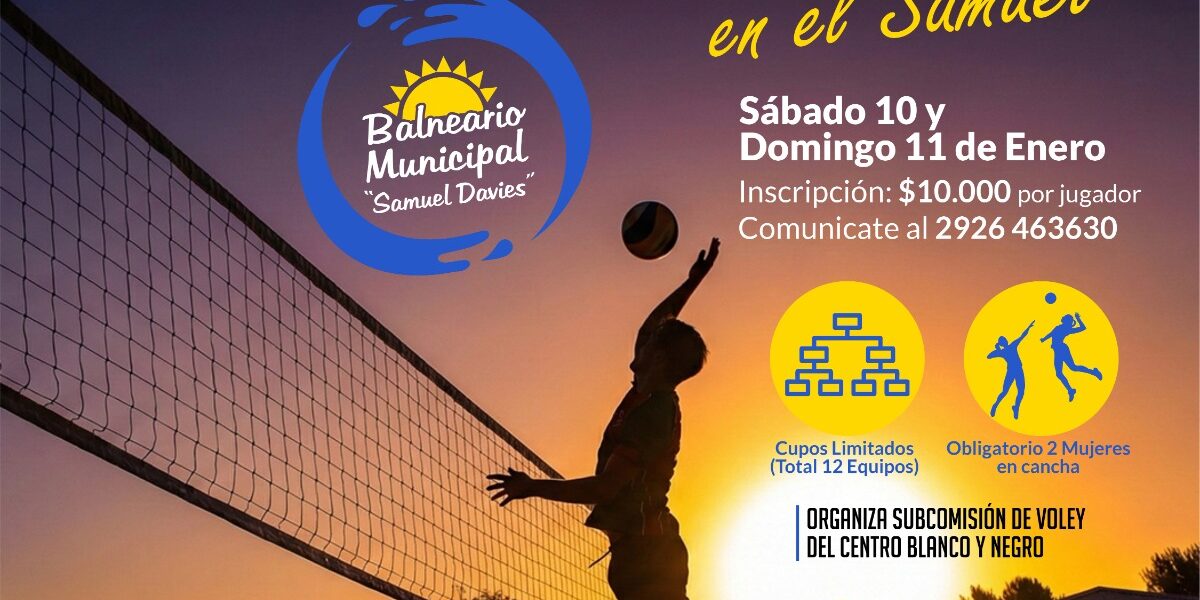 Organiza Subcomision de Voley del Centro Blanco y Negro. Se jugará el sábado 10 y domingo 11 de enero. Podrán inscribirte hasta el 9 de enero por whatsapp al 429269. Cupos limitados -solo 12 equipos. Obligatorio 2 mujeres en cancha. Inicia el sábado 10, a las 15:00. VALOR DE LA INSCRIPCIÓN: $ 10.000 por jugador.