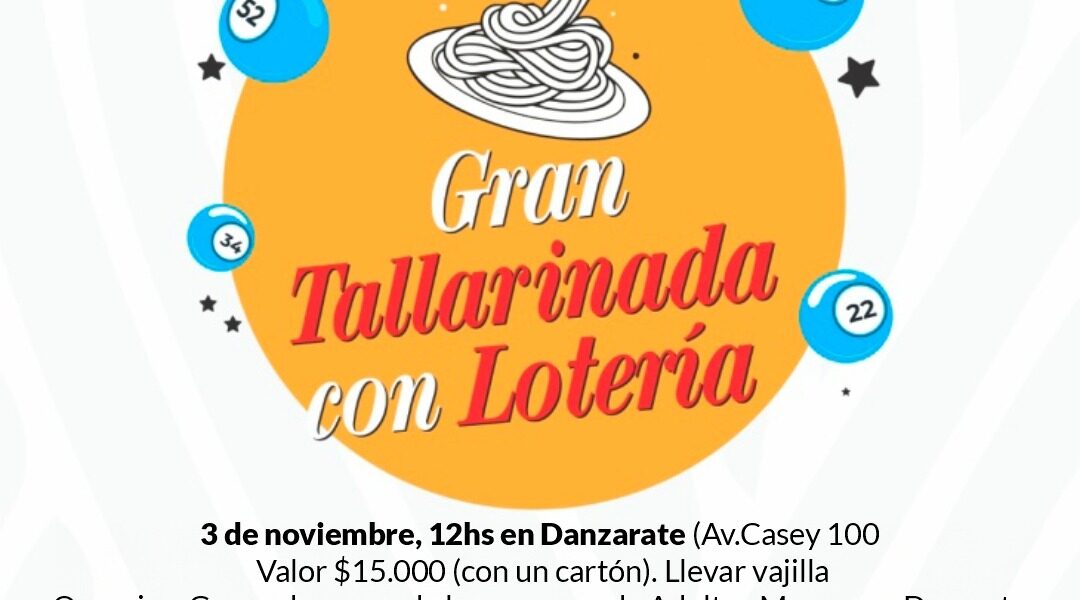 Será el domingo 3 de noviembre, a las 12:00, en Danzarte. Valor de la tarjeta: $15.000 -incluye cartón de regalo-. El Grupo de apoyo de la Comparsa de Personas Mayores junto a Danzarte organiza la última gran tallarinada con lotería del año; el próximo 3 de noviembre, en Danzarte. La tarjeta tiene un valor de $15.000 e incluye: -3 salsas