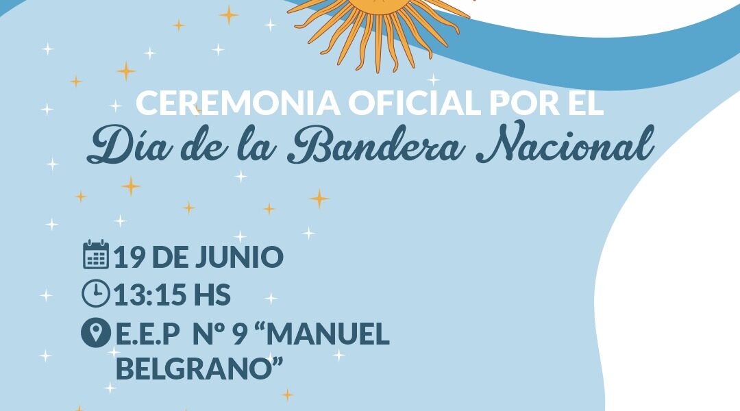La Municipalidad de Coronel Suárez y la Jefatura de Inspección Distrital de la Dirección General de Cultura y Educación, informan que la ceremonia oficial por el Día de la Bandera Nacional se llevará a cabo el día 19 de junio a las 13:15 hs. en el Escuela de Educación Primaria Nº 9 “ Manuel Belgrano”.
