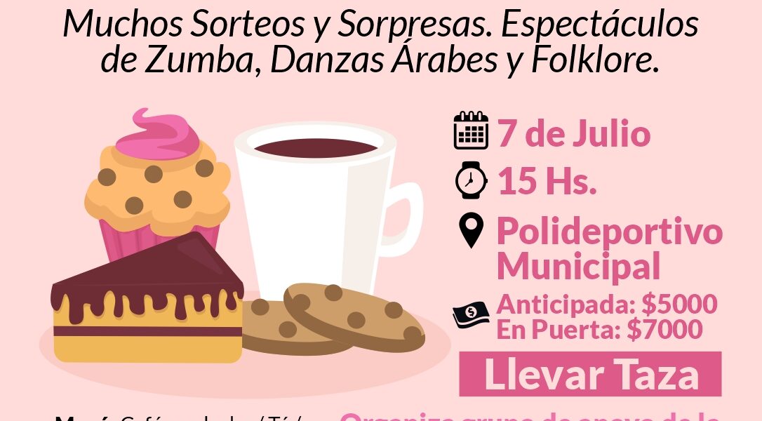 Domingo 7 de julio, a las 15, en el Polideportivo Municipal. Café con leche/té/Chocolate y tortas varias. Llevar taza. Sorteos y muchas sorpresas. Espectáculos de Zumba, Danzas Árabes y Folclore. Las entradas anticipadas tienen un valor de $5000, mientras que en puerta $7000. Búscalas en Danzarte o ante integrantes de la Comparsa. Organiza: Grupo de Apoyo de la Comparsa de