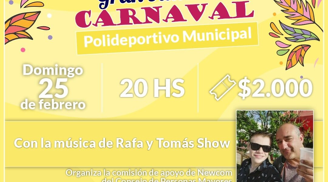 Con la música de Rafa y Tomás Show. Organiza la comisión de apoyo de Newcom del Consejo de Personas Mayores. Día: Domingo 25 de febrero Hora: 20 hs. Valor de la entrada: $ 2000