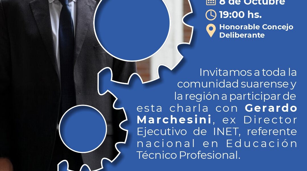 El próximo miércoles 8 de octubre, a las 19 horas, en el recinto del Honorable Concejo Deliberante de Coronel Suárez, recibiremos al destacado docente Licenciado Gerardo Marchesini, quien fuera Director Ejecutivo del Instituto Nacional de Educación Tecnológica (INET) durante la gestión del ministro Jaime Perczyk. En esta charla abierta a la comunidad suarense y la región, Marchesini abordará: La importancia