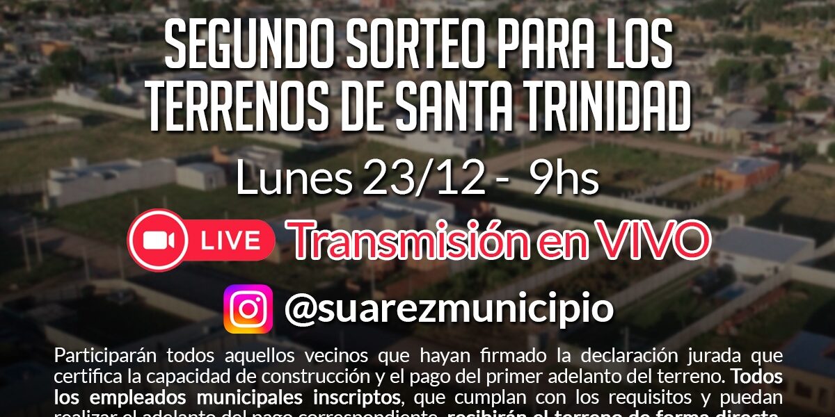El acto será trasmitido en VIVO por las redes de Suárez Municipio: Instagram @suarezmunicipio. Gracias a las gestiones realizadas por el Intendente Ricardo Moccero y el apoyo constante del Gobernador Axel Kicillof, el próximo lunes 23 de diciembre a las 9 se llevará a cabo el sorteo de 136 terrenos para familias del distrito, reafirmando el compromiso de la Gestión