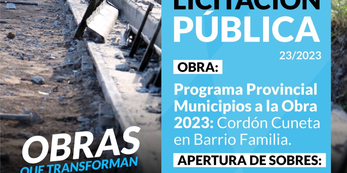 Por dos días: “Programa Provincial Municipios a la Obra 2023 – Cordón Cuneta en Barrio Familia” EXPEDIENTE: MCS-644/2023. DECRETO: 2248/2023. PLAZO DE EJECUCIÓN DE OBRA: 60 días corridos. VALOR DEL PLIEGO: $ 50.700. VENTA Y CONSULTAS AL PLIEGO: Hasta 2hs. antes de la apertura en la Secretaría de Obras Públicas – Rivadavia 165 – Coronel Suárez – Tel: (02926) 429288