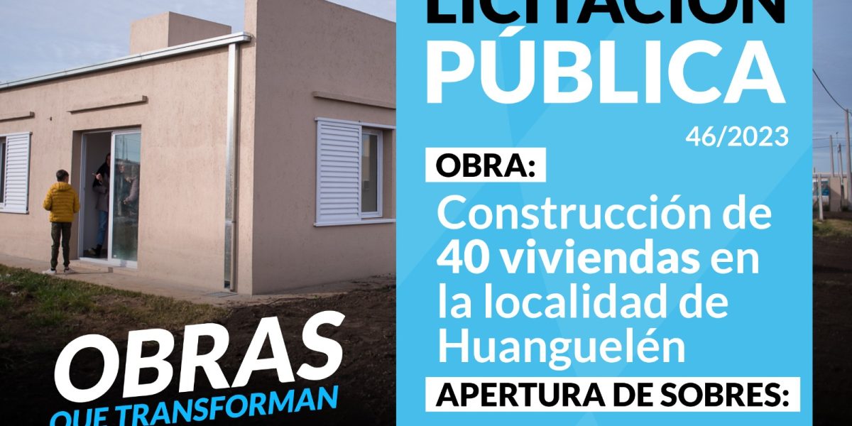 “Construcción 40 viviendas en la localidad de Huanguelén – Partido de Coronel Suárez” EXPEDIENTE: MCS-1266/2023. DECRETO: 3382/2023. PLAZO DE EJECUCIÓN DE OBRA: 365 días corridos. VENTA Y CONSULTAS AL PLIEGO: Hasta 2hs. antes de la apertura en la Secretaría de Obras Públicas – Rivadavia 165 – Coronel Suárez – Tel: (02926) 429288 – Mail: mesaentradaop@coronelsuarez.gob.ar . APERTURA DE OFERTAS: 19