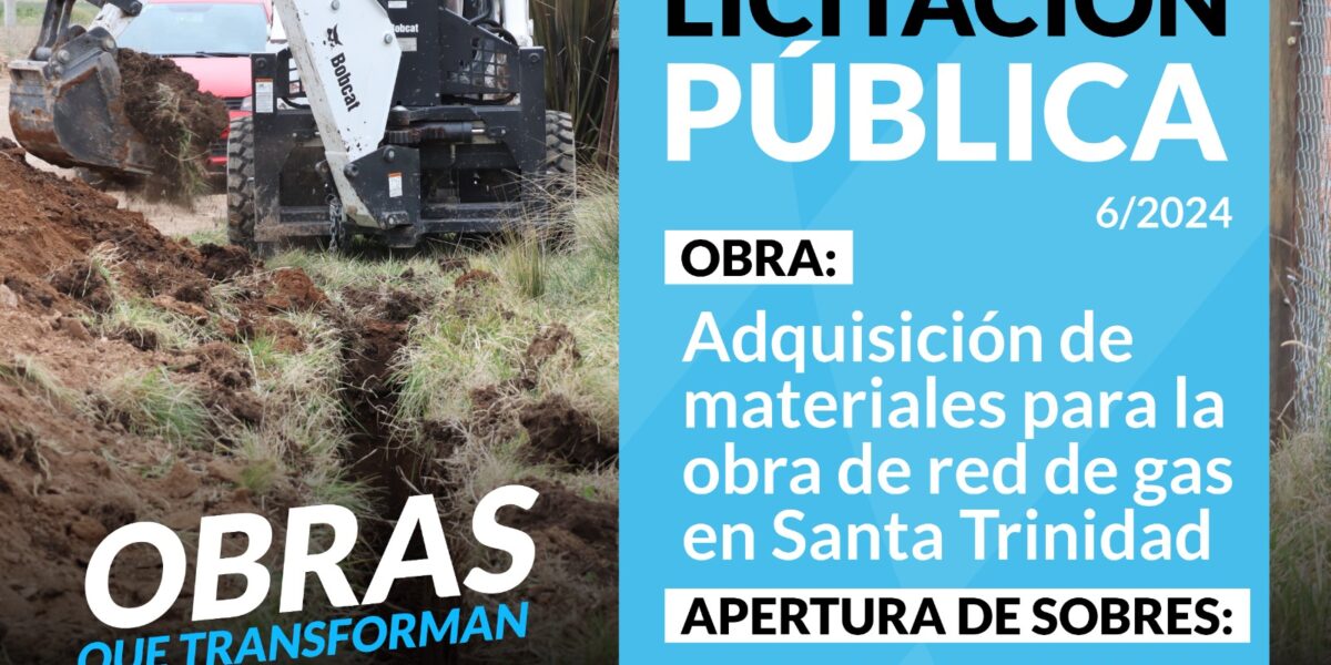 Objeto: Adquisición de materiales para la obra de red de gas en Pueblo Santa Trinidad – Etapa 1 EXPEDIENTE: MCS- 514/2024 DECRETO: 1351/2024 VALOR DEL PLIEGO: $60.500.- VENTA Y CONSULTAS AL PLIEGO: Hasta 2hs. antes de la apertura en la secretaría de Obras Públicas –Rivadavia 165- Coronel Suárez. Tel: 2926-429288. Mail: mesaentradaop@coronelsuarez.gob.ar APERTURA DE OFERTAS: 18 de junio de 2024