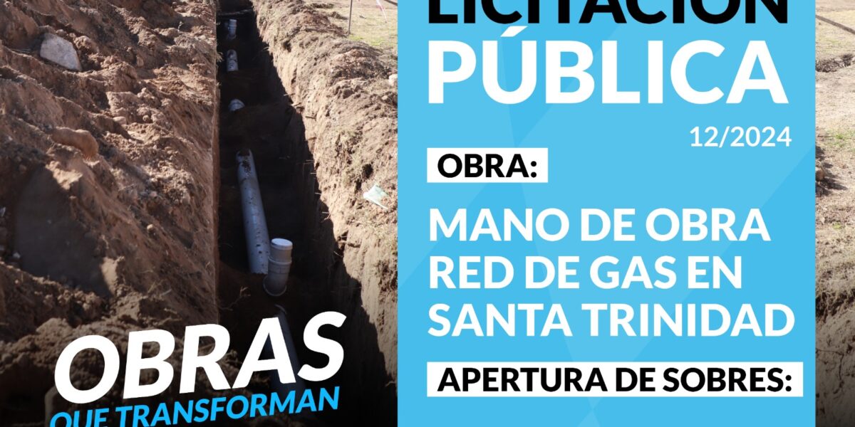 Objeto: Mano de obra de gas en Santa Trinidad –Etapa 1 Expediente: MCS- 454/2024 Decreto: 1920/2024 Valor del pliego: $100.000.- Venta y consultas al pliego: Hasta 2hs. antes de la apertura en la secretaría de Obras Públicas –Rivadavia 165- Coronel Suárez. Tel: 2926-429288. Mail: mesaentradaop@coronelsuarez.gob.ar Apertura de ofertas: Viernes 30 de agosto de 2024, 8:00hs., Dirección de Compras, Rivadavia 155.