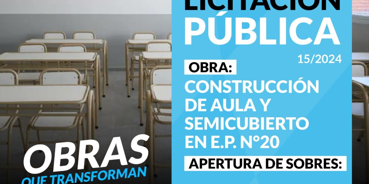 CONSTRUCCION DE AULA Y SEMICUBIERTO EN E.P. Nº20 EXPEDIENTE:MCS-1086/2024 DECRETO: 2237/2024 PLAZO DE EJECUCIÓN DE OBRA: 120 días corridos VALOR DEL PLIEGO: $ 86.500,00.- VENTA Y CONSULTAS AL PLIEGO: Hasta 24 hs. antes de la apertura. en la Secretaria de Obras Públicas-Rivadavia 165-Coronel Suárez – Tel: (02926) 429288- Mail: mesaentradaop@coronelsuarez.gob.ar APERTURA DE OFERTAS: MIERCOLES 16 DE OCTUBRE DE 2024 –