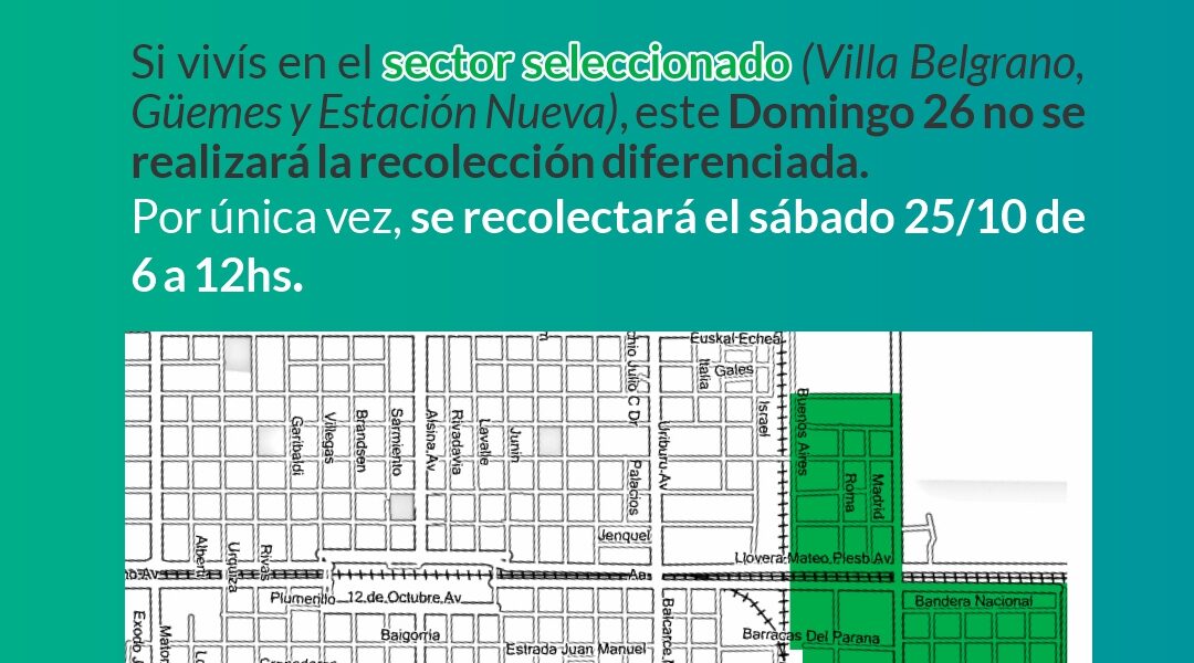 Se informa a los vecinos de Villa Belgrano, Güemes y Estación Nueva que, debido a un inconveniente con un camión, la recolección de materiales reciclables que debía realizarse el domingo se adelantará por única vez al sábado 25 de octubre. Importante: Por favor, sacar los reciclables el sábado y no el domingo, para asegurar el correcto funcionamiento del servicio.