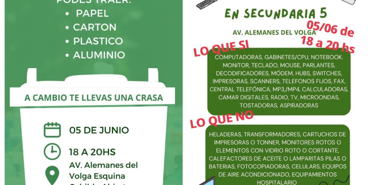 La Subdirección de Ambiente invita a la comunidad a participar de las jornadas de Eco Canje que se realizarán el día martes 4 de Junio en la Escuela de Educación Técnica Nº1, y el miércoles 5 de Junio en la Escuela de Educación Secundaria Nº5 de Pueblo Santa Trinidad. Se podrán llevar residuos reciclables o RAEES (Residuos de Aparatos