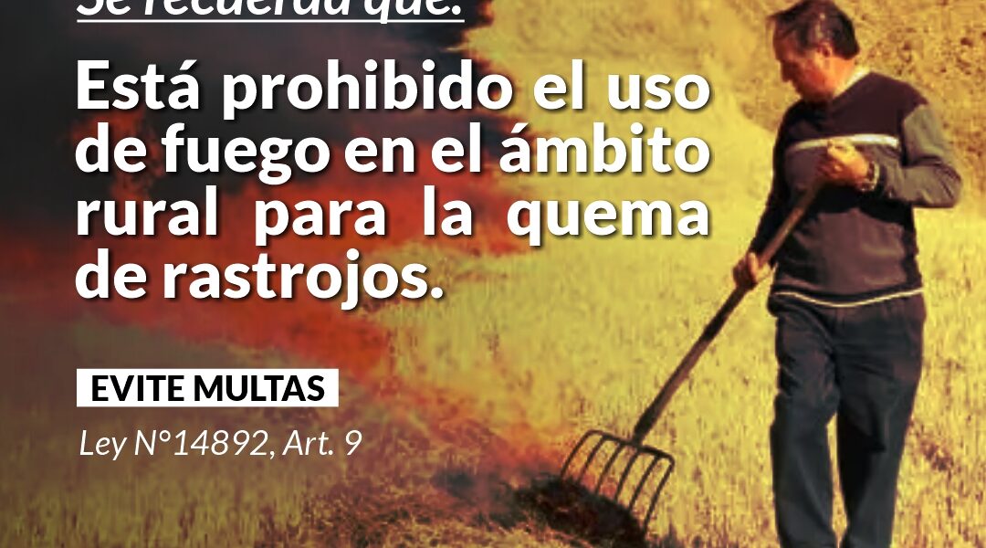Se informa a la población que el uso de fuego para actividades rurales (quema controlada de rastrojos, pastizales) se encuentra PROHIBIDA, según lo establecido por la Ley N°14892 de la provincia de Buenos Aires en su artículo 9; por lo que el uso del fuego en violación de esta norma, dará lugar a las sanciones previstas por la normativa. Dada