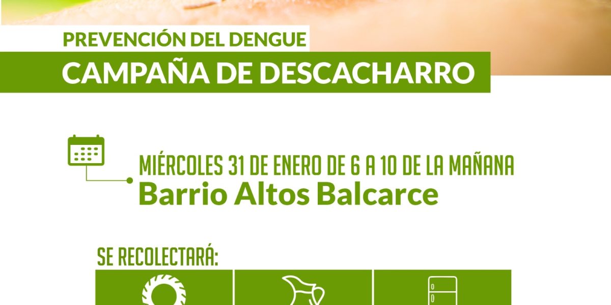 La dirección de Atención Primaria de la Salud, junto a Servicios Públicos y Ambiente continúan realizando tareas de prevención y descacharro en los barrios de Coronel Suárez y pueblos alemanes, a fin de evitar la reproducción del mosquito trasmisor del dengue. En tal sentido, la cuadrilla de Servicios Públicos recorrerá el próximo miércoles 31 de enero la barriada de Altos