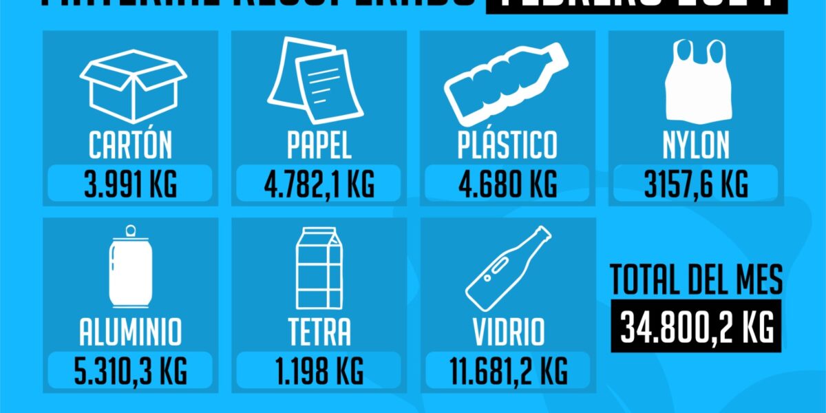 La subdirección de Ambiente informa que durante el mes de FEBRERO se vendieron 34.800,2 kg. de material recuperado en la Planta de Separación y Tratamiento de Coronel Suárez. Material recuperado en la Planta de Separación y Tratamiento de Coronel Suárez: ☑CARTÓN: 3.991KG ☑PAPEL: 4.782,1KG ☑PLÁSTICO: 4.680KG ☑NYLON: 3157,6KG ☑ALUMINIO: 5.310,3KG ☑TETRA: 1.198KG ☑VIDRIO: 11.681,2KG
