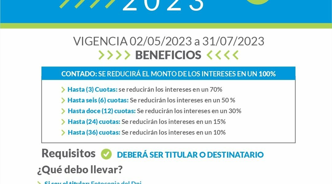 Hasta el 31 de julio podés adherirte a los beneficios de la MORATORIA MUNICIPAL 2023. ¿Qué beneficios tenés? PAGO CONTADO: se reducirá el monto de los intereses en un 100% HASTA 3 CUOTAS: Se reducirán los intereses en un 70% HASTA 6 CUOTAS: Se reducirán los intereses en un 50% HASTA 12 CUOTAS: Se reducirán los intereses en un 30%