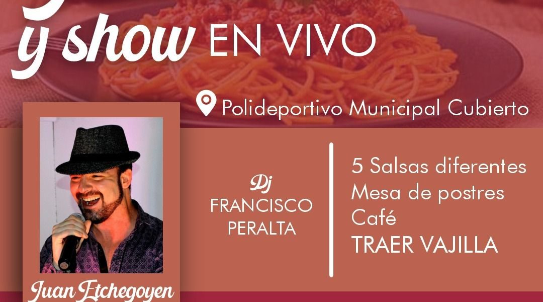 Sábado 16 de septiembre, a las 20:30, en el polideportivo municipal cubierto. Por consultas comunicarse al 2926-421066.- Se presentará Juan Etchegoyen y amenizará la noche el DJ Francisco Peralta. Menú: Tallarines, 5 salsas diferentes, mesa de postre y café. Llevar vajilla. Entradas anticipadas hasta el 30 de agosto $5000. Del 1 al 10 de septiembre $6000. Del 11 al 16