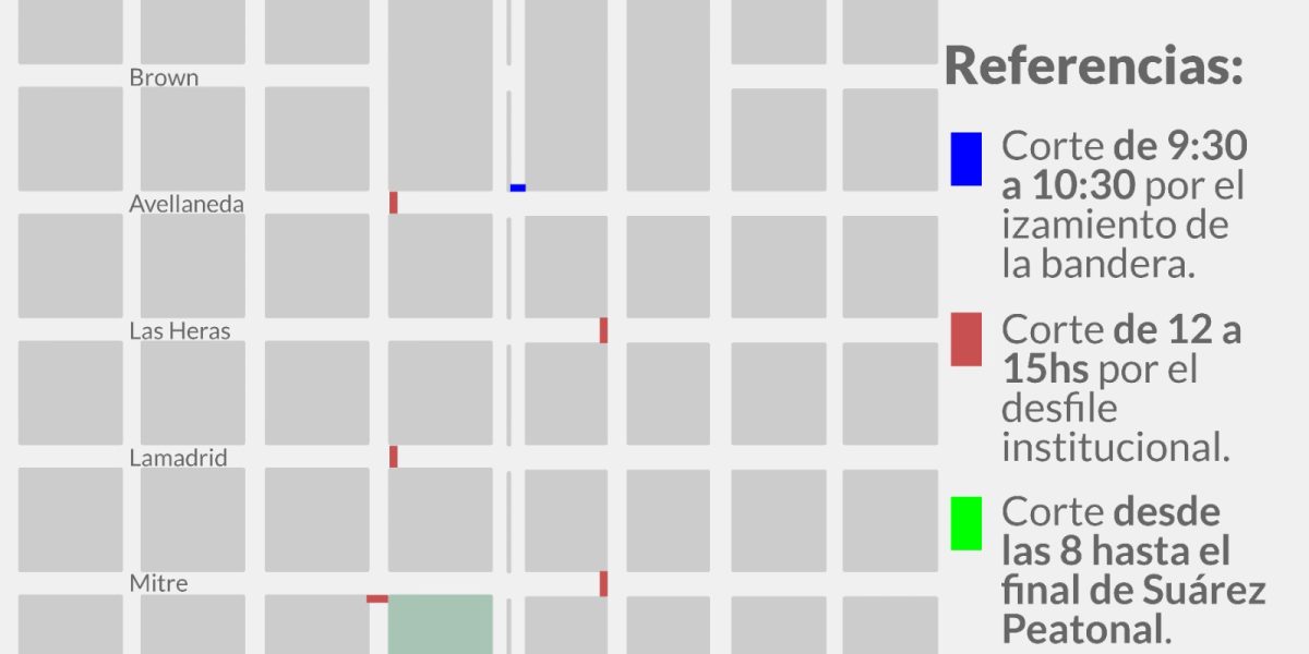Siguen los preparativos para un nuevo Aniversario del Distrito de Coronel Suárez. Los cortes de calles previstos para la jornada son: • Izamiento de la Bandera Nacional en el Mástil Patrio –a partir de las 9:30 horas y hasta finalizar el izamiento- : -Sixto Rodríguez y Sarmiento en dirección a Deportivo Sarmiento. -Sixto Rodríguez y Rivadavia en dirección al Mástil.