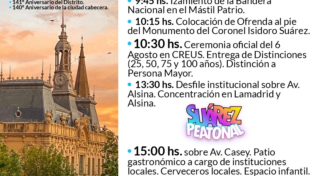 El domingo 6 de agosto te esperamos para participar de los actos y festejos por un nuevo aniversario de nuestro querido Coronel Suárez. Cronograma: 9:30hs. Concentración en el hall del Palacio Municipal. 9:45hs. Traslado e izamiento de la Bandera Nacional al Mástil Patrio. 10:15hs. Colocación de ofrenda al pie del Monumento al Coronel Isidoro Suárez. 10:30hs. Ceremonia oficial en