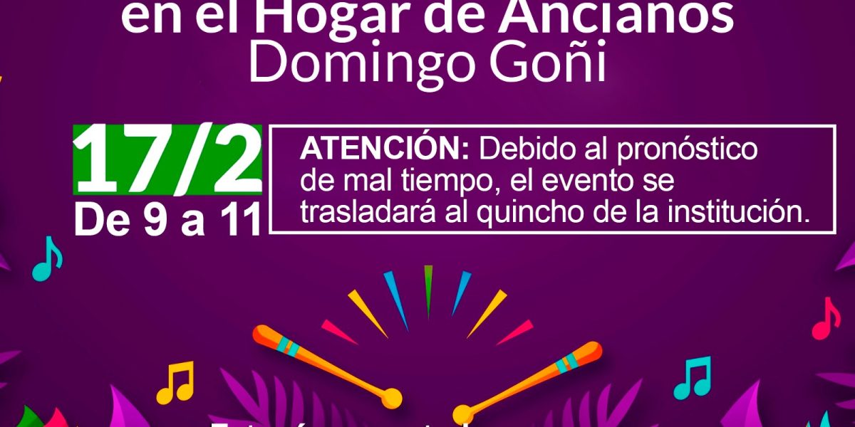 La dirección del Hogar de Ancianos “Domingo Goñi” informa que dado el pronóstico del tiempo anunciado para el viernes, el evento de carnaval se trasladará al quincho de la institución en el mismo horario, es decir, de 9 a 11, con la presencia de la Comparsa de Personas Mayores.