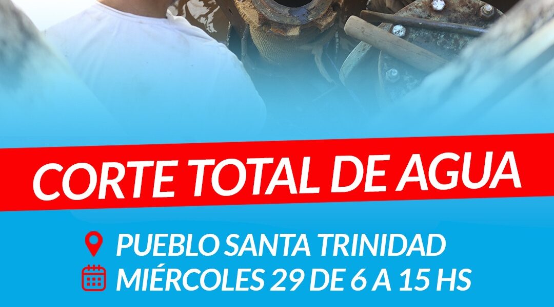 La delegación de Pueblo Santa Trinidad informa a los vecinos que el día miércoles 29 de octubre, se realizará un corte total del suministro de agua en toda la localidad debido a trabajos de empalme de cañerías en el barrio Techo Digno. El corte se extenderá desde las 6:00 hasta las 15:00 horas. Se recomienda a los vecinos tomar