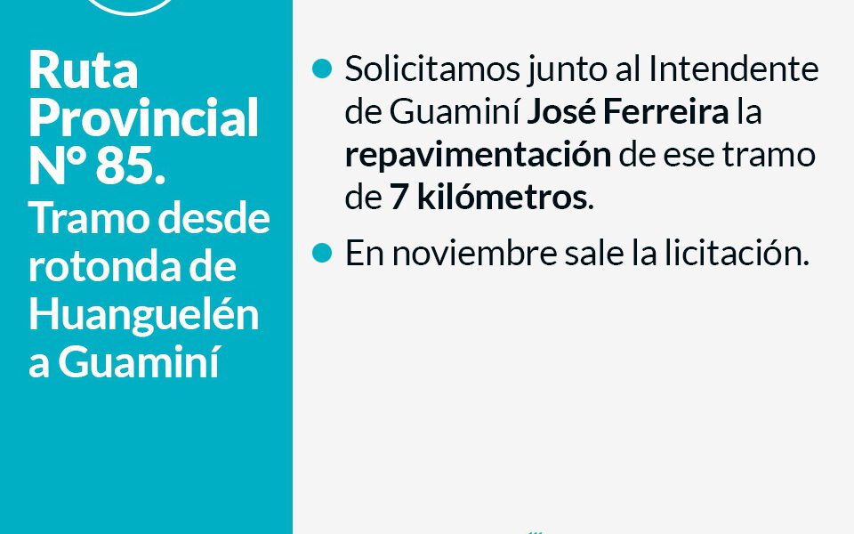 ???En el mes de diciembre se licitarán 50 kilómetros de obra. También confirmó la licitación para la repavimentación de la Ruta Provincial N° 85 en el tramo desde la rotonda de Huanguelén a Guaminí, el tramo de la Ruta N° 76 hasta el cruce con la Ruta N° 72 a Sierra de la Ventana y el camino Estación Primavera.