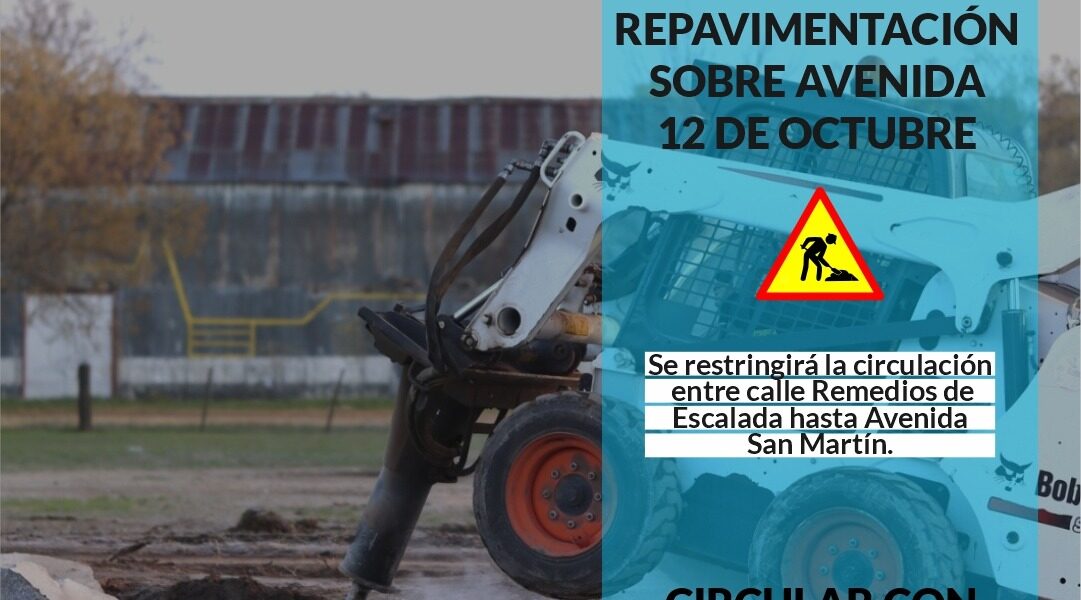 Se restringirá la circulación entre calle Remedios de Escalada hasta avenida San Martín. Circular con precaución. La secretaria de Obras Públicas informa que HOY comenzaron los trabajos de repavimentación sobre la avenida 12 de octubre, desde calle Los Patos hasta avenida San Martín. ⚠️ Por tal motivo, se solicita a la población tomar los siguientes recaudos ✅La avenida 12 de