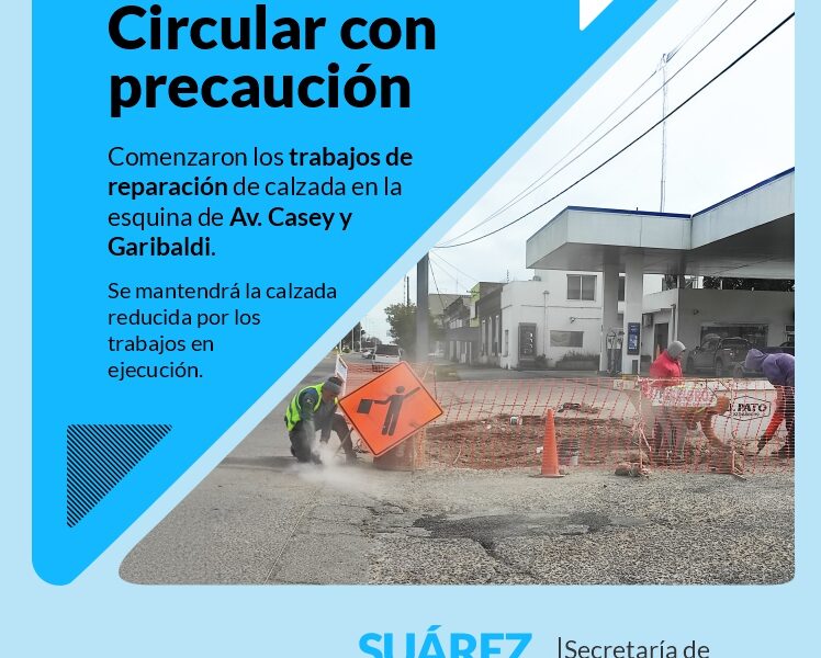 La secretaria de Obras Públicas informa a la población que comenzaron los trabajos de la primera etapa de reparación/repavimentación de media calzada, badén y curva en hormigón en la intersección de Garibaldi y avenida Casey. En tal sentido, se mantendrá la calzada reducida por los trabajos en ejecución, por lo que se solicita precaución al momento de transitar por