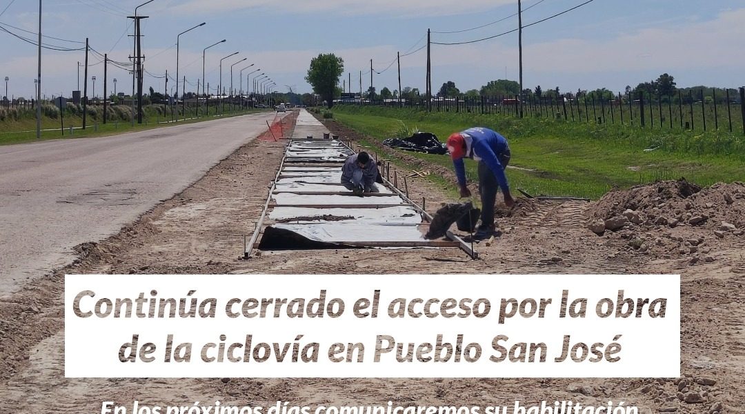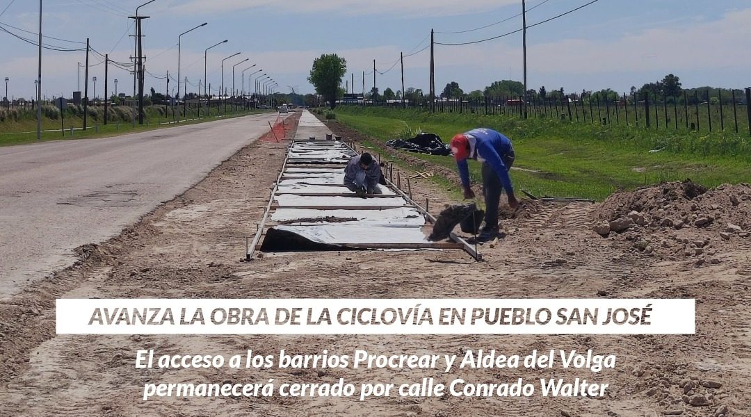 La secretaría de Obras Públicas informa a los vecinos de PUEBLO SAN JOSÉ que permanecerá cerrado el acceso a los barrios PROCREAR y ALDEA DEL VOLGA por calle CONRADO WALTER (ingreso por avenida Alemanes del Volga); debido al avance de la obra de la nueva ciclovía. Es importante remarcar, la necesidad de “evitar la circulación” por el sector donde
