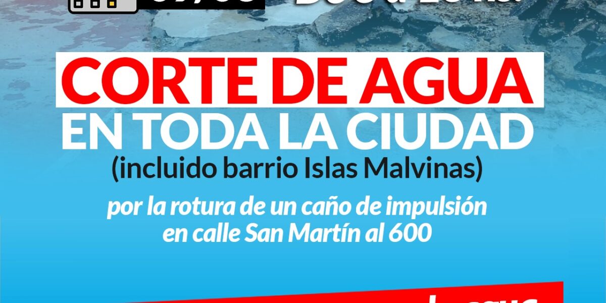 El Servicio de agua corriente dependiente de la Secretaría de obras Públicas informa a la población que se realizara un corte total en el suministro de agua corriente, incluido barrio Islas Malvinas este sábado 9 de 6 a 16 hs. Por reparación de cañería de impulsión en calle San Martin al 600. Por más información dirigirse a nuestras oficinas en