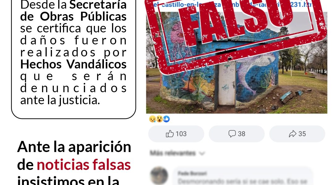 La secretaria de Obras Públicas del Municipio aclara una información “falsa” que está circulando por redes, acerca del “peligro de derrumbe” en el castillo de la plaza Tambor de Tacuarí. En tal sentido, se informa que desde la secretaria de Obras Públicas se realizó la inspección del espacio público, certificando que los daños fueron producidos por HECHOS VANDÁLICOS, que serán