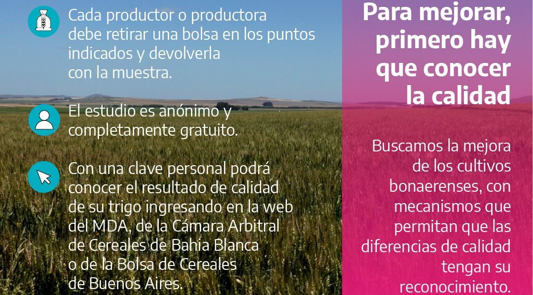 Con nuestro Programa de mejoramiento y diferenciación para la calidad de trigo buscamos la mejora de la calidad de los cultivos que se producen en la PBA y que cada productor/a pueda conocer las características de su producción. Además, generamos mecanismos que promueven el reconocimiento de las diferencias de calidad. Para más información dirigirse a la Dirección de Producción en