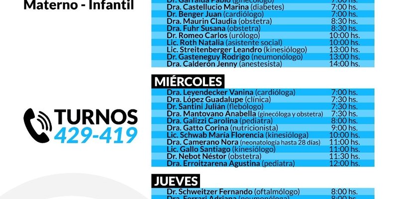 La Secretaría de Salud informa a la comunidad los días y horarios de atención del Materno Infantil del Hospital Municipal «Dr. Raúl Caccavo». Por turnos comunicarse al teléfono: 2926-429419