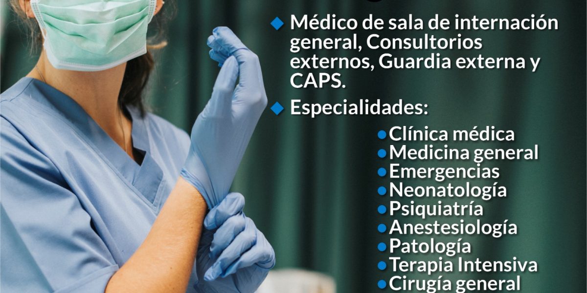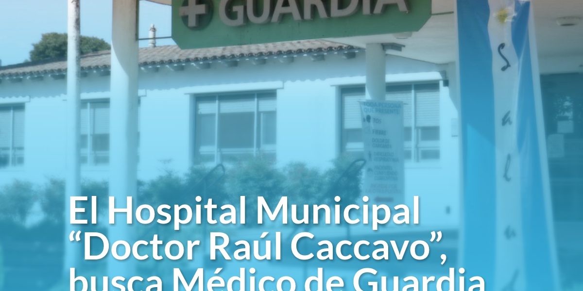 Desde el Hospital Municipal Dr. Raúl Caccavo se llama a cubrir el cargo de médico de guardia de emergencias de adultos. Carga horaria: 12 horas diurnas de día viernes Régimen: Carrera profesional hospitalaria Contacto: Dra. Adriana Ferrari; Jefa de emergencias. Teléfono 2926-429413/ whatsapp 2926-457971.-