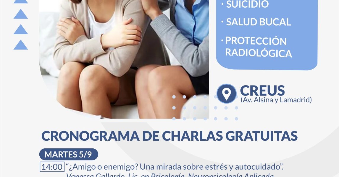 Profesionales de la salud abordarán temáticas como estrés, suicidio, salud bucal y protección radiológica a través de charlas gratuitas, en el Centro Regional Educativo Universitario Suarense (CREUS), durante la semana del martes 5 al viernes 8 de septiembre. La secretaría de Salud en forma conjunta con la Asociación de Profesionales y Técnicos de la Salud de Cnel. Suárez (APTS), invita