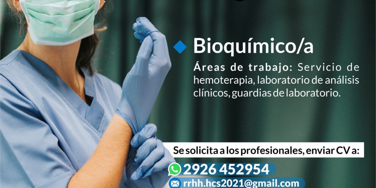 La secretaria de Salud llama a cubrir cargo de: bioquímico/a Título: bioquímico Áreas de trabajo: servicio de hemoterapia, laboratorio de análisis clínicos, guardias de laboratorio. Se solicita a los profesionales enviar CV al whatsapp 2926452954, al correo electrónico rrhh.hcs2021@gmail.com o personalmente en la oficina de RRHH de la secretaria de salud del municipio de Cnel Suarez.