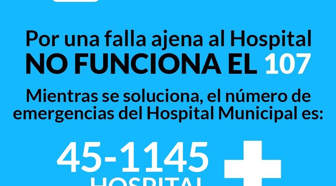 Informamos que, por causas ajenas al Hospital Municipal “Dr. Raúl Caccavo”, el número de emergencias 107 se encuentra momentáneamente fuera de servicio. Hasta que se solucione el inconveniente, para comunicarse con la guardia del hospital, podrán llamar o enviar mensaje al 2926 45-1145. Les pedimos agendar este número y compartir la información para que todos puedan acceder rápidamente ante