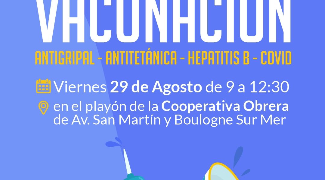 El viernes 29 de agosto, de 9 a 12:30, se llevará a cabo una nueva jornada de vacunación en el playón de la Cooperativa Obrera de la Avenida San Martín. Se aplicarán las siguientes vacunas: Antigripal Antitetánica Hepatitis B Covid-19 La actividad es organizada por el CAPS de Barrio San Martín y está destinada a toda la comunidad. ¡Acercate